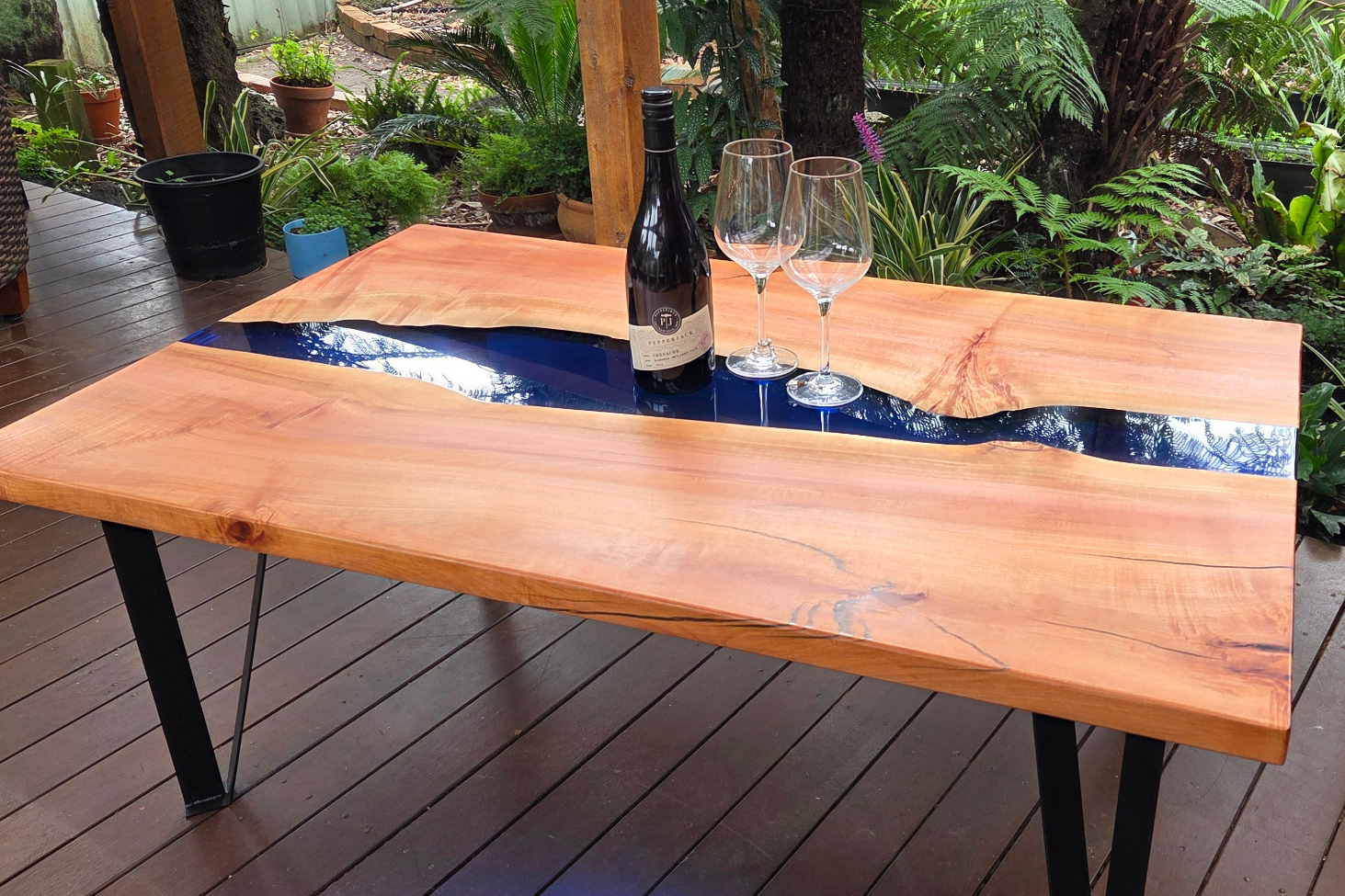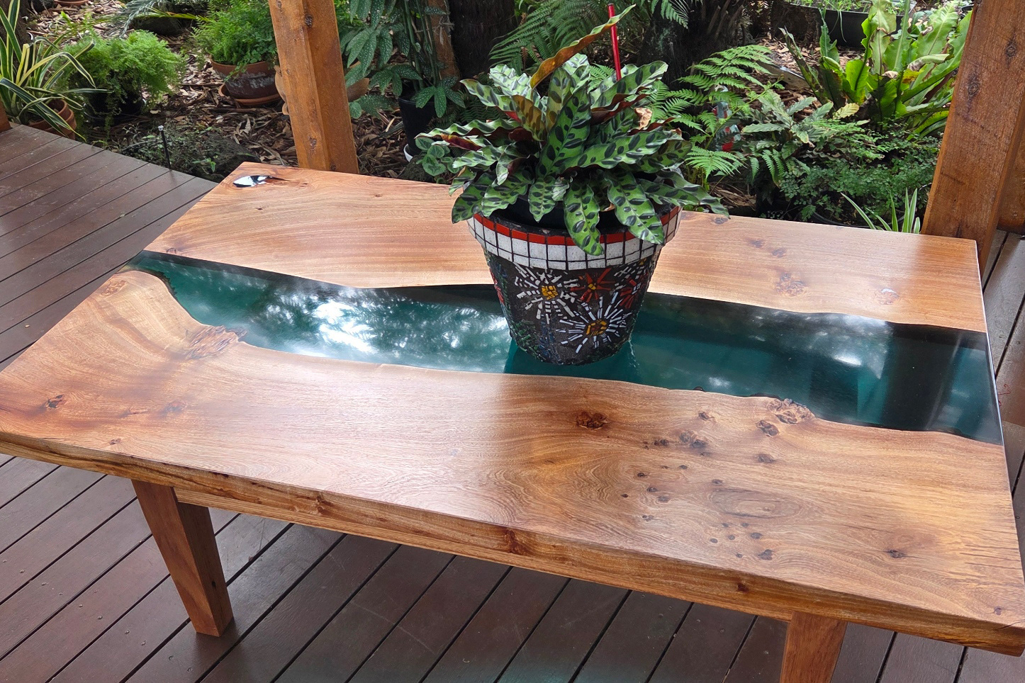 Silky Oak Dining Table With Live Edge And Clear Green Resin